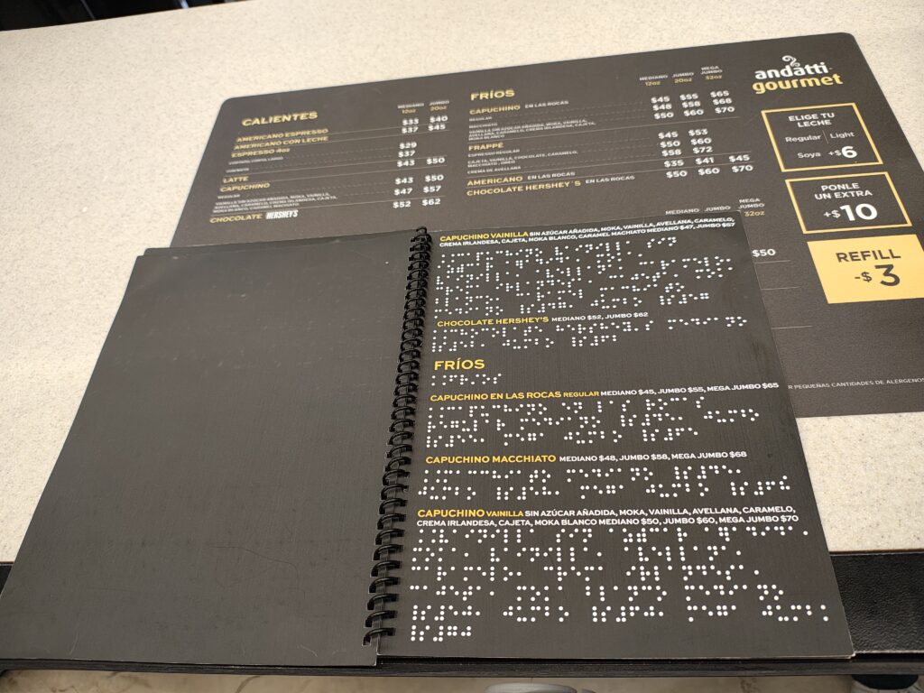 Código braille: Esta herramienta de comunicación escrita para personas con discapacidad visual es utilizada para la señalización de productos y secciones de la tienda.