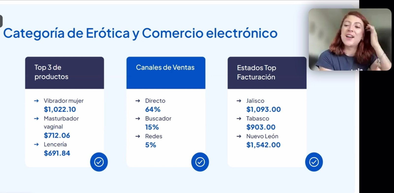 Los productos más vendidos son vibradores femeninos,lencería,lubricantes y cápsulas para orgasmos femeninos. El canal de ventas directo representa 64 por ciento,seguido por buscadores web (15%) y redes sociales (5%). La tarjeta de débito es el método de pago preferido (43%),ya que los consumidores prefieren liquidar el producto en lugar de pagar a meses sin intereses,y el 85 por ciento de los envíos se realizan a domicilio,siendo el móvil el dispositivo de compra más usado (69%).